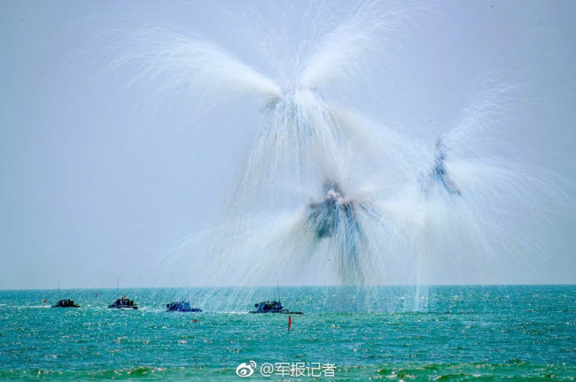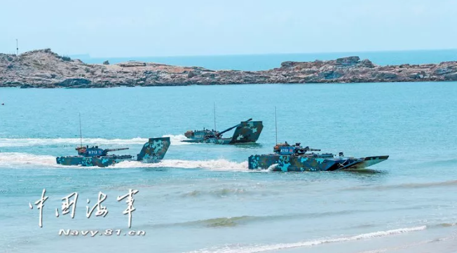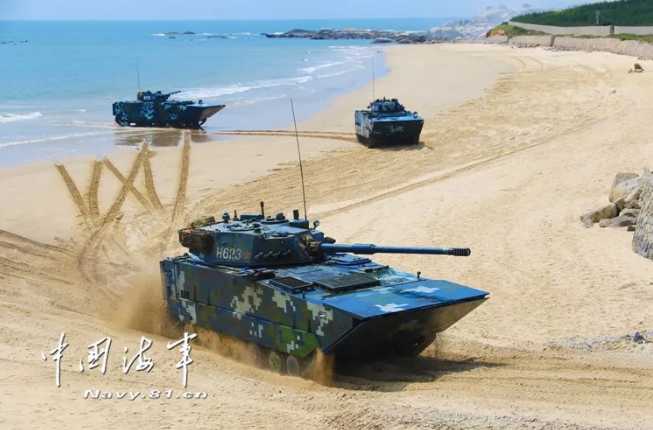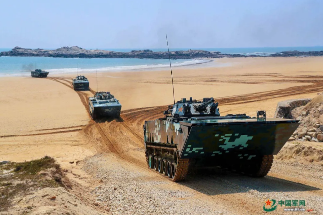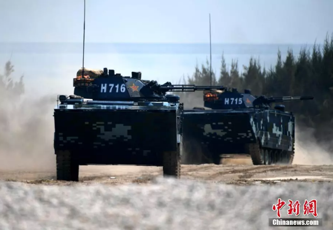 作戰(zhàn)課目演示中,兩棲裝甲車從海上發(fā)起沖擊,泛水抵灘后迅速鎖定目標(biāo),大口徑突擊炮、車載機(jī)槍連番開火,遠(yuǎn)方的靶標(biāo)紛紛應(yīng)聲而落。