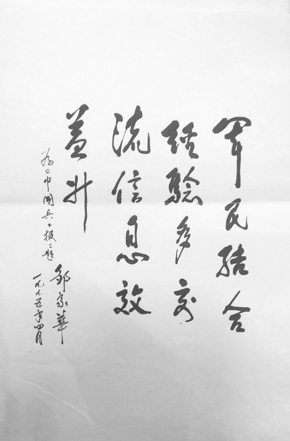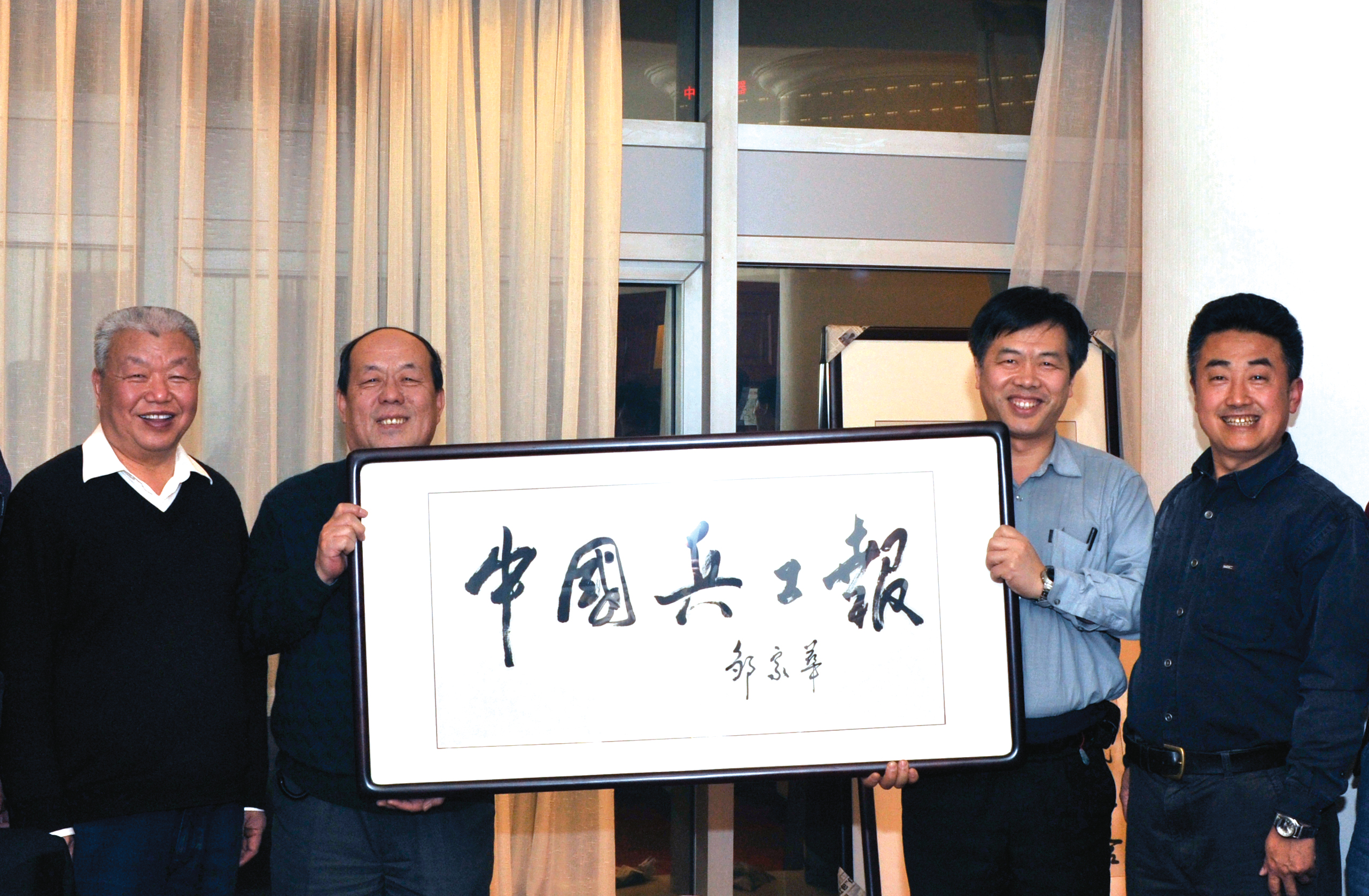 1994年11月14日,原兵器工業(yè)總公司總經(jīng)理張俊九致函時任中共中央政治局委員、國務(wù)院副總理鄒家華,懇請他為《中國兵工報》題寫報紙名稱。鄒家華對兵器工業(yè)格外關(guān)心,第一次為軍工行業(yè)即將創(chuàng)刊的報紙題寫報名(見報紙刊頭)并題詞:軍民結(jié)合經(jīng)驗多,交流信息效益升(見下圖)。