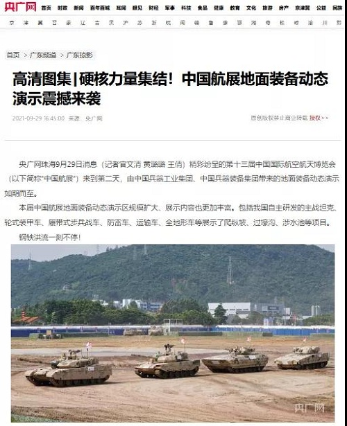 9月28日-10月3日,第十三屆中國國際航空航天博覽會在廣東珠海舉行,中國兵器工業(yè)集團(tuán)有限公司作為主辦單位閃耀亮相,推出裝甲突擊、火力打擊、智能彈藥、防空反導(dǎo)、無人裝備、非傳統(tǒng)安全、軍工軍技合作等領(lǐng)域新產(chǎn)品及成體系成建制武器系統(tǒng)和解決方案,全方位展示我國陸軍外貿(mào)武器裝備的最高水平以及雄厚的科技創(chuàng)新、自主研發(fā)與先進(jìn)制造能力,受到廣泛關(guān)注。 央視《新聞聯(lián)播》報道第十三屆中國航展,著重介紹了VT4主戰(zhàn)坦克,關(guān)注航展公眾日中國兵器館情況。9月28日下午央視《新聞直播間》航展特別節(jié)目《藍(lán)天盛會》邀請集團(tuán)公司訪談嘉賓做客直播間對中國兵器館兵器工業(yè)集團(tuán)展區(qū)等進(jìn)行1小時直播;9月28日下午、10月2日下午分別對地面裝備動態(tài)表演進(jìn)行兩場直播。央視《朝聞天下》、《新聞直播間》、《共同關(guān)注》、《天下財經(jīng)》、《軍事報道》、《正午國防軍事》、《軍武零距離》等相繼推出集團(tuán)公司參展裝備的報道。