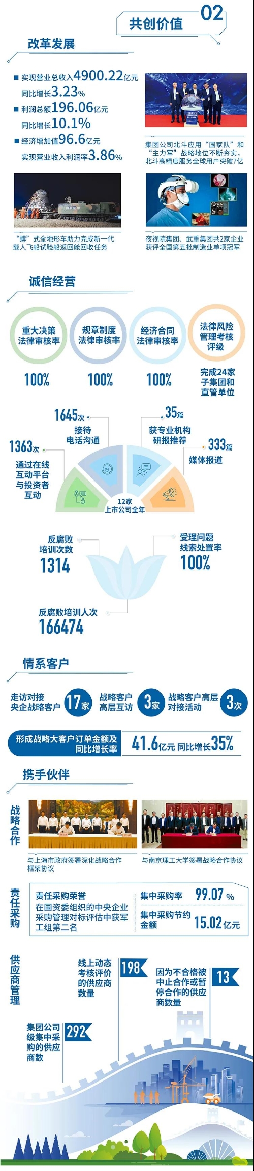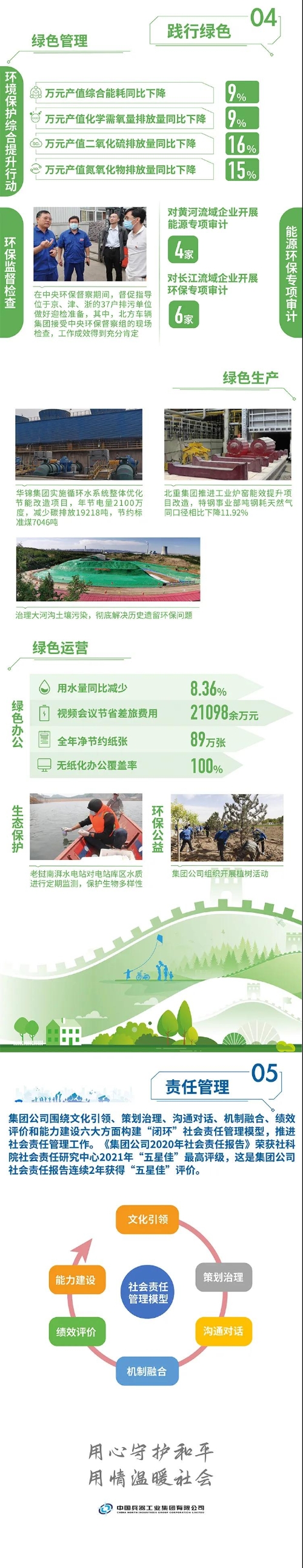 近日,國務(wù)院國資委在京舉辦“責(zé)任創(chuàng)造價值,責(zé)任引領(lǐng)未來——中央企業(yè)社會責(zé)任報告集中發(fā)布活動(2021)”,來自中央企業(yè)的92份《報告》向公眾全面展示央企認真履行社會責(zé)任的成果。兵器工業(yè)集團參加集中發(fā)布活動,并向社會公眾正式發(fā)布第十二份年度社會責(zé)任報告——《中國兵器工業(yè)集團有限公司2020年社會責(zé)任報告》,全面披露2020年度集團公司履責(zé)實踐和履責(zé)成效。會上發(fā)布了《中央企業(yè)社會責(zé)任藍皮書(2021)》,《中國兵器工業(yè)集團有限公司:內(nèi)化于心外化于行,打造央企責(zé)任管理表率》成功入選典型案例。 2020年,是“十三五”規(guī)劃收官之年,也是全面建成小康社會、實現(xiàn)第一個百年目標的決勝之年。集團公司黨組書記、董事長焦開河在報告開篇指出,集團公司實現(xiàn)了“十三五”圓滿收官,整體步入了高質(zhì)量發(fā)展軌道,呈現(xiàn)出基礎(chǔ)更牢、動力更強、空間更大、效能更高的積極向上良好態(tài)勢。在“十三五”特別是近三年來的工作實踐中,我們明確了“集團公司是國家安全和國防建設(shè)的脊梁、是國家戰(zhàn)略科技力量最為重要的組成部分、是黨和國家最可信賴的‘六個力量’,肩負著支撐國防軍隊建設(shè)、推動科技自立自強、服務(wù)構(gòu)建新發(fā)展格局的重大政治責(zé)任和光榮使命,具有極強的政治屬性,性質(zhì)特殊、使命特殊、責(zé)任特殊”的新時代新階段職責(zé)使命,深化了對“堅持以習(xí)近平新時代中國特色社會主義思想定向領(lǐng)航,是集團公司高質(zhì)量發(fā)展的根本遵循;保持貫徹落實習(xí)近平總書記重要指示批示和黨中央決策部署的戰(zhàn)略定力,是集團公司高質(zhì)量發(fā)展的根本前提;履行好強軍這個首要職責(zé),是集團公司高質(zhì)量發(fā)展的根本要求;加快兵器科技創(chuàng)新突破,是集團公司高質(zhì)量發(fā)展的根本支撐;加強黨的領(lǐng)導(dǎo)黨的建設(shè),是集團公司高質(zhì)量發(fā)展的根本保證”的兵器工業(yè)改革發(fā)展規(guī)律認識。 《報告》聚焦“抗疫斗爭中的‘兵器力量’”,生動展示了集團公司抗擊疫情的有力行動,展現(xiàn)了集中力量辦大事、急國家之所急的“兵器速度”,彰顯了“把一切獻給黨”的人民兵工精神和貫徹落實國家決策部署的責(zé)任擔(dān)當(dāng)?!秷蟾妗芬浴坝眯氖睾蚝推?、用情溫暖社會”為主題,從恪守本責(zé)、共創(chuàng)價值、致力和諧、踐行綠色、責(zé)任管理五個維度,全面展現(xiàn)集團公司在堅持履行政治責(zé)任、經(jīng)濟責(zé)任、社會責(zé)任,履行強軍首責(zé)、加強黨的建設(shè)、打造國家戰(zhàn)略科技力量、推進“一帶一路”倡議、打好打贏三大攻堅戰(zhàn)、深化改革、助力員工成長、支持社會公益事業(yè)、提升社會責(zé)任管理等方面的生動實踐和履責(zé)亮點,凸顯集團公司保持貫徹落實黨中央決策部署的戰(zhàn)略定力、在聚焦主責(zé)主業(yè)、科技引領(lǐng)、國際化經(jīng)營上持續(xù)用力,為實現(xiàn)第一個百年奮斗目標貢獻力量的初心與行動?!秷蟾妗吩俅潍@得中國企業(yè)社會責(zé)任報告評級專家委員會“五星佳”最高評級,兵器工業(yè)集團成為軍工行業(yè)唯一連續(xù)10年獲得最高評級的企業(yè)。 2021年是開啟新征程的開局之年,也是建黨100周年、人民兵工創(chuàng)建90周年,兵器工業(yè)集團將全面貫徹落實黨中央戰(zhàn)略部署,緊扣推動高質(zhì)量發(fā)展主題,圍繞“十四五”開好局、起好步,堅決完成黨中央賦予的職責(zé)使命,履行好中央企業(yè)和軍工集團的政治責(zé)任、經(jīng)濟責(zé)任、社會責(zé)任,為實現(xiàn)中國夢強軍夢作出新的更大貢獻! 一圖看懂《中國兵器工業(yè)集團有限公司2020年社會責(zé)任報告》 |