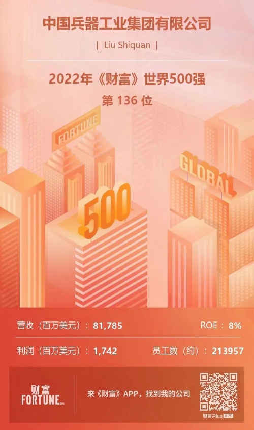 兵器工業(yè)集團(tuán)位列2022年《財富》世界500強(qiáng)第136位